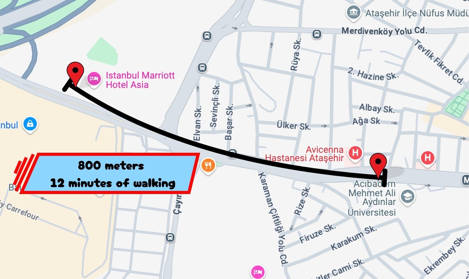 The distance between Acıbadem University and the Marriott Hotel is approximately 800m and takes 12 minutes of walking.